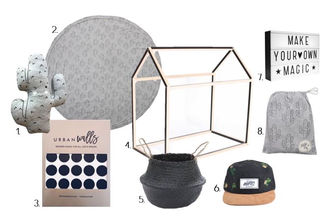 1. Coussin cactus, 55$ 2. Sac et tapis de jeu cactus, 89$ 3. Autocollants muraux points, 34$ 4. Maisonnette Tagada noir, 299$ 5. Panier noir - medium, 49$ 6. Casquette Aie Aie Aie, 29$ 7. Grand caisson lumineux noir, 59$ 8. Drap contour cactus, 59$